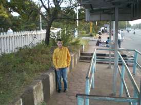 I'm posing nearby a bus station.
